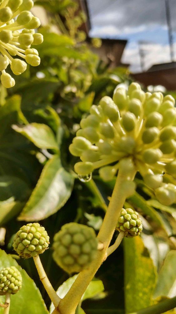 ②ヤツデの蕾に💧1、2個咲き始めて🐝が来てます😄