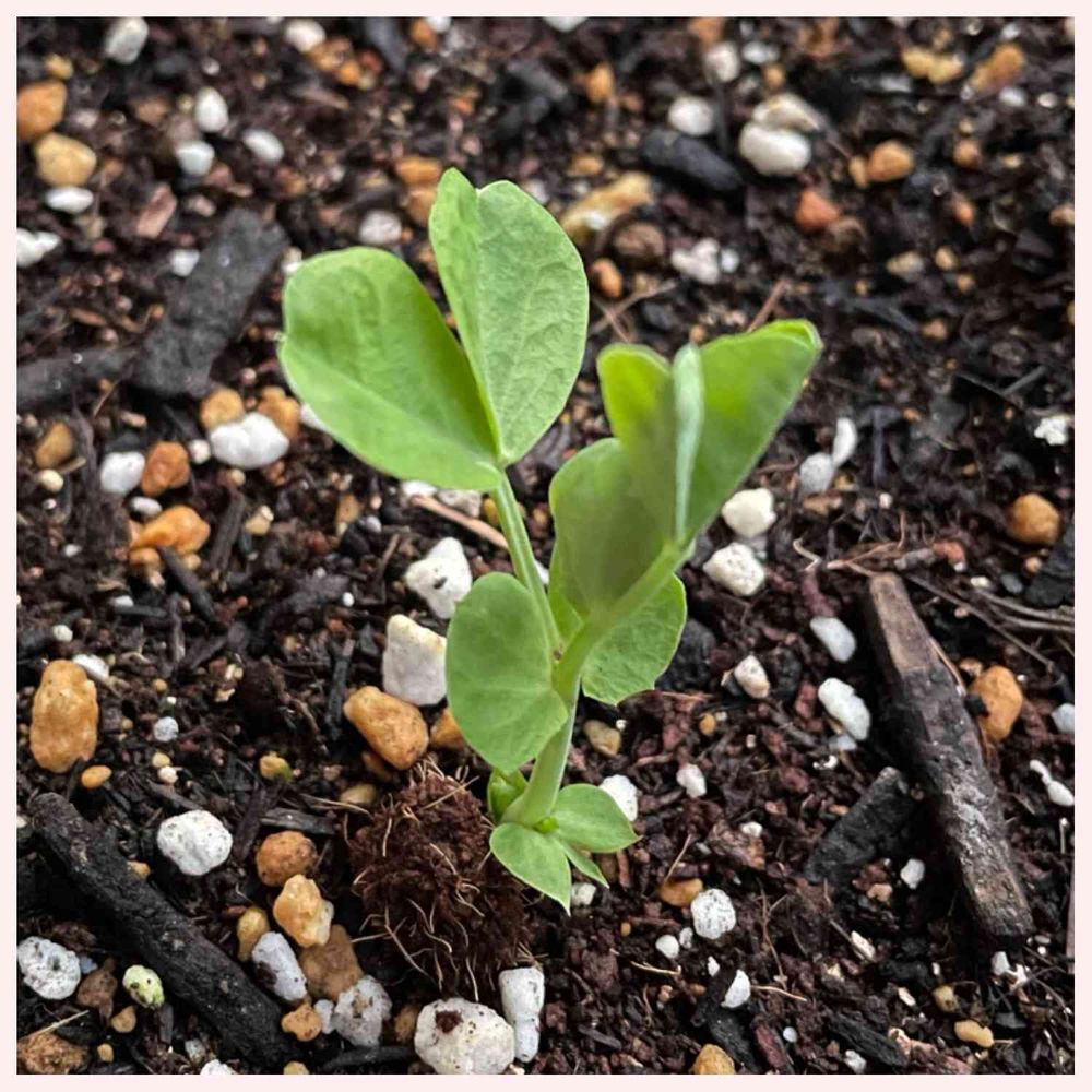 ②お隣りさんから種を頂いたサヤエンドウ🫛芽が出てきました🌱♬赤い花と白い花が咲くようです〜楽しみどわわ〜😍