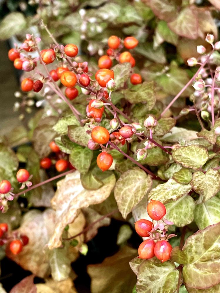 斑入りの葉に小さな白花が咲きその後たくさんのオレンジ色の果実を実らせます