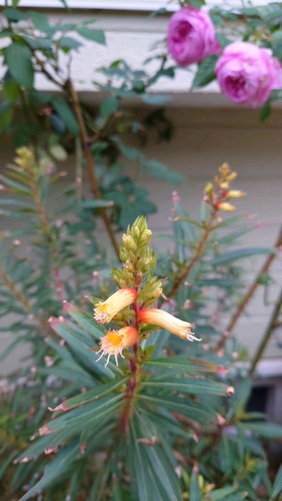 茎は赤っぽく葉はヤナギのようで、高さ1メートル オレンジ色で先端部黄色い筒状の花が咲き始めました🧡💛