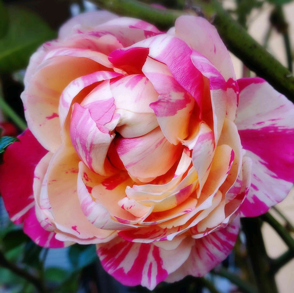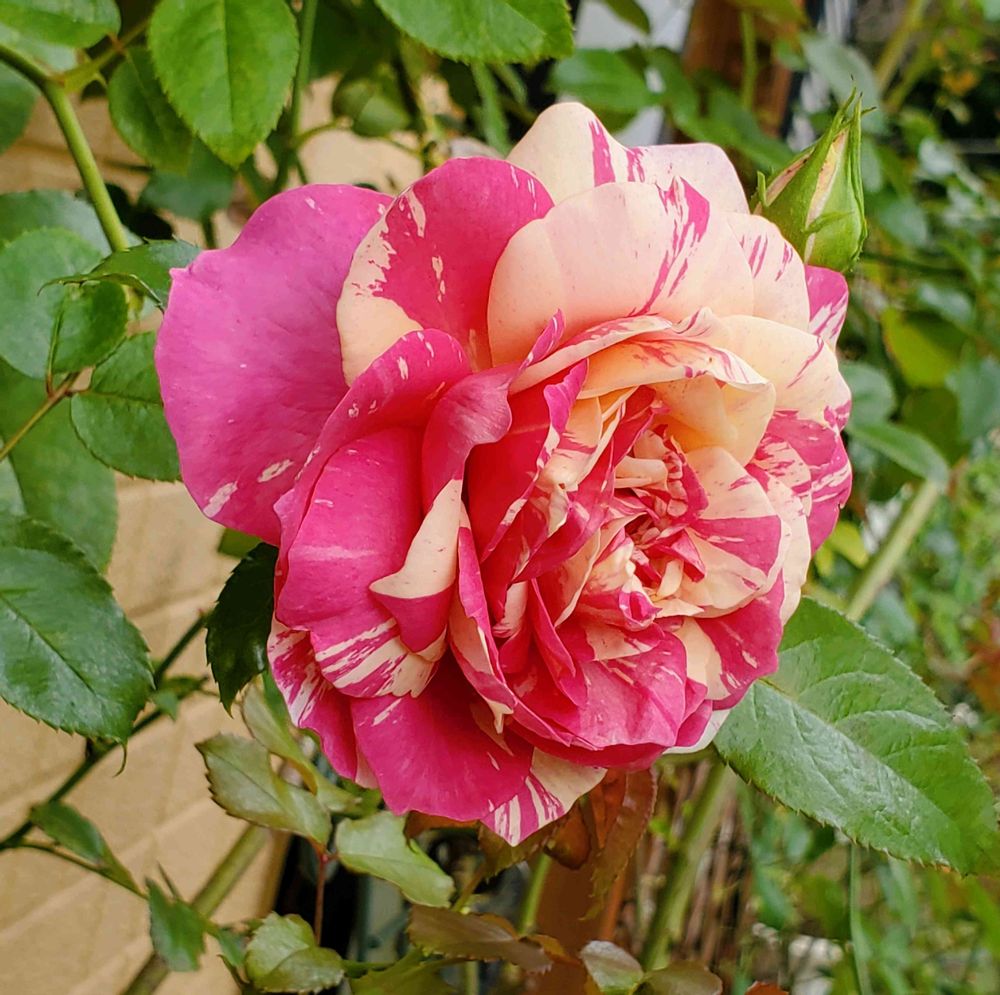 玄関の所で咲いてるバラ🌹ね。絞りのバラ🌹って綺麗ですよね。😍