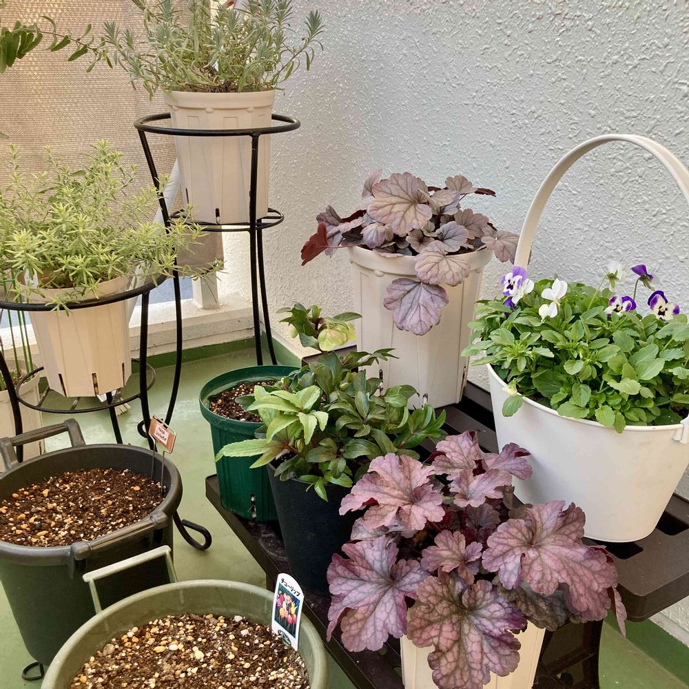 ヒューケラドルチェ2種類とクリスマスローズのウインターベル🔔、生協さんで買ったビオラの寄せ植え、そして先日植えた球根チームです。