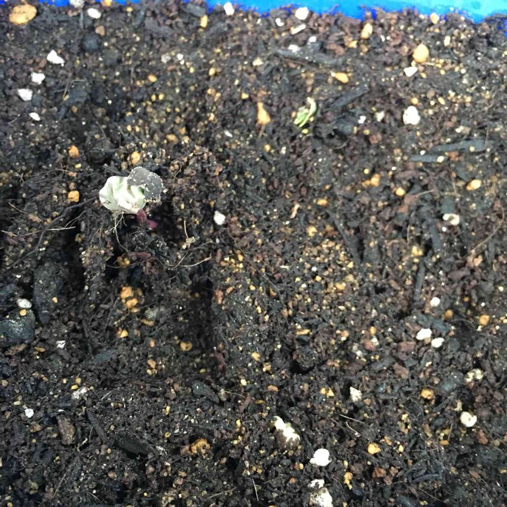 数日前から30度前後で発芽しやすい環境だったから毎朝そわそわしてたが帰宅したら、帽子を被った、しわしわの葉っぱが✨