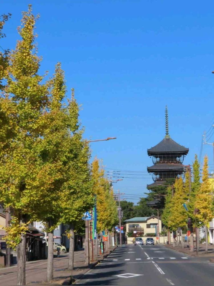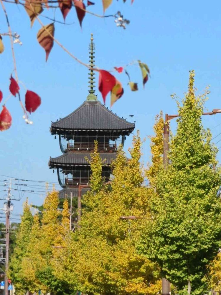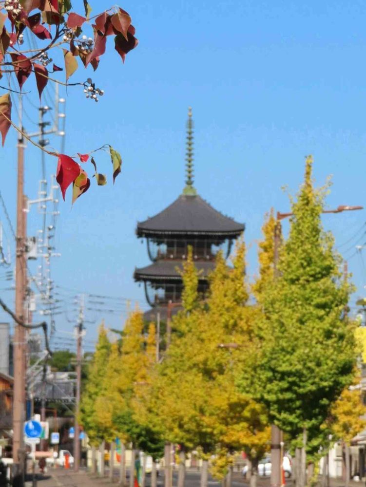 澄みきった秋空のもと、色付き始めたイチョウ並木とナンキンハゼが五重塔と素敵なコラボを見せてくました。