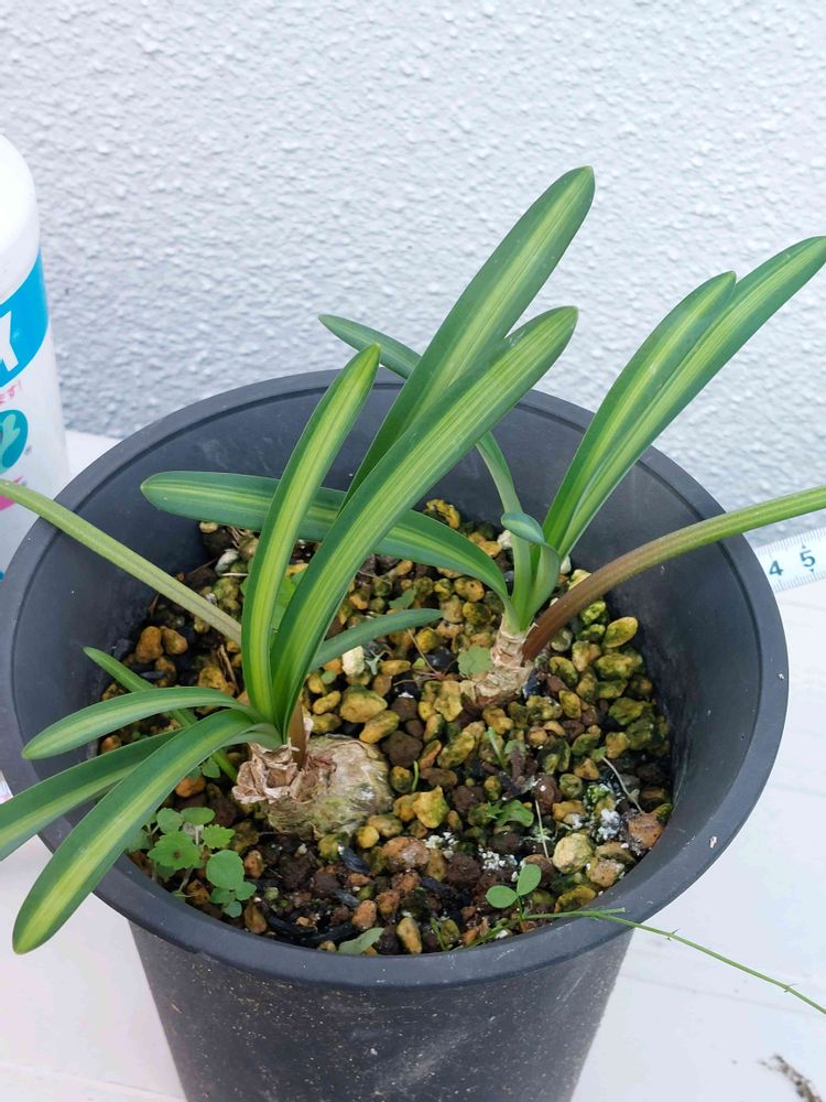 数年前に流行った斑入り(模様葉)のネリネです。花茎にも縞柄が入りダークレッドの花も綺麗です。