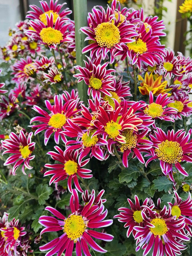 はじめは黄色が沢山だったけど、満開時はエンジ色が多く。