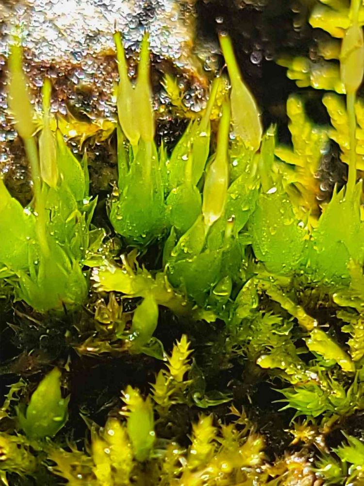 蒴は成長中です。柄の長さはバラバラです。濡れていますが葉っぱはこんな感じでプックリです。