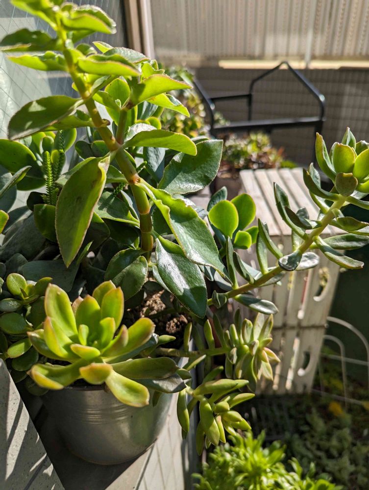 山梨から里帰りした、大型バケツの野生派地味多肉の寄植え、✄して、だいぶスッキリさせたつもり