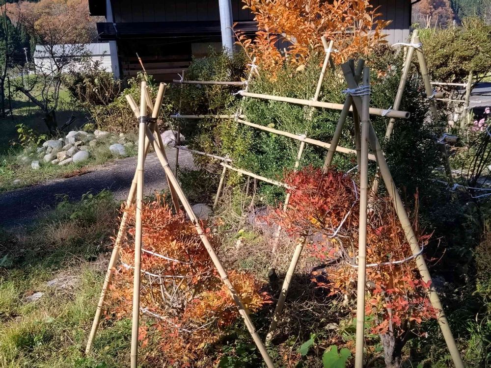 午前中はコメリの白竹で庭木の雪囲い。