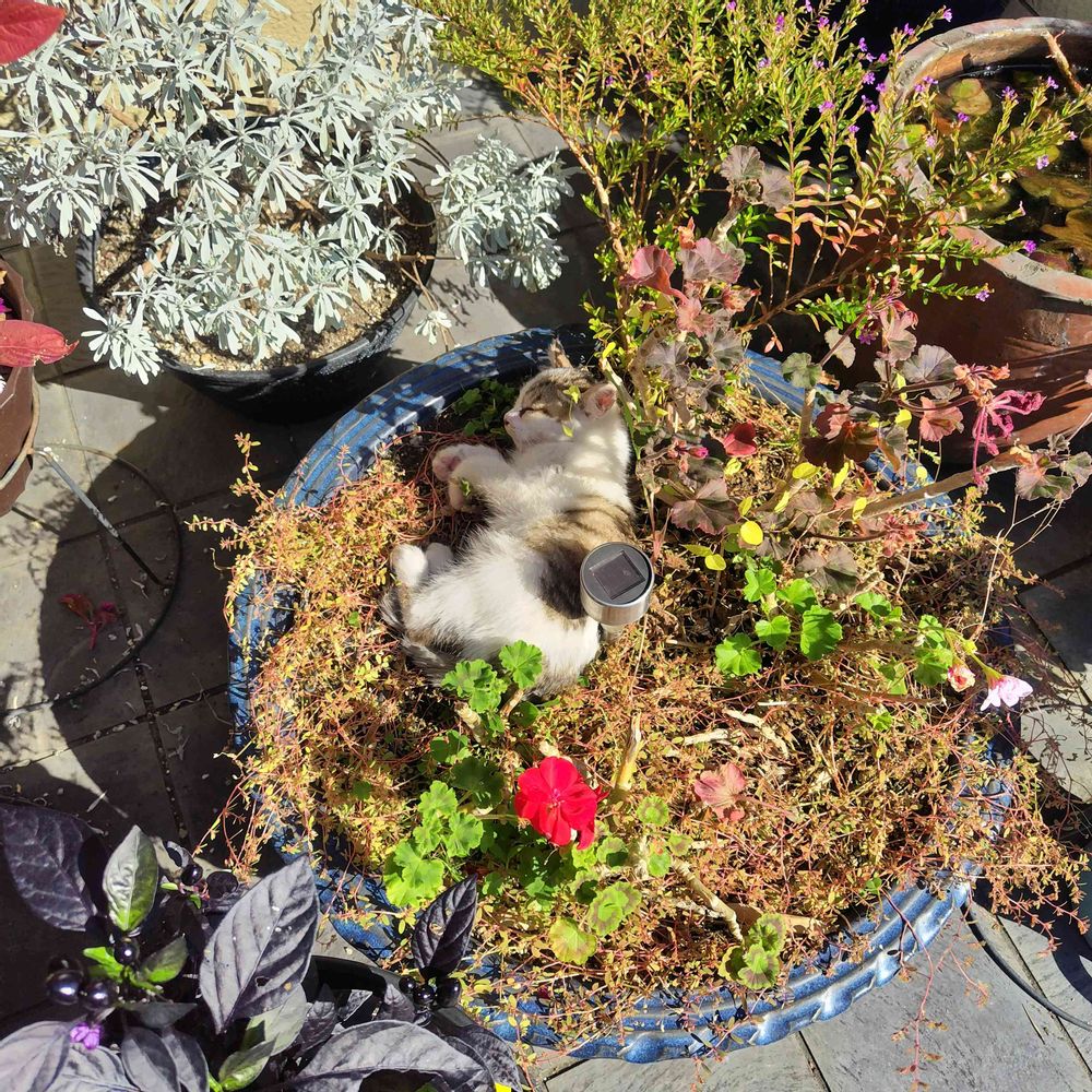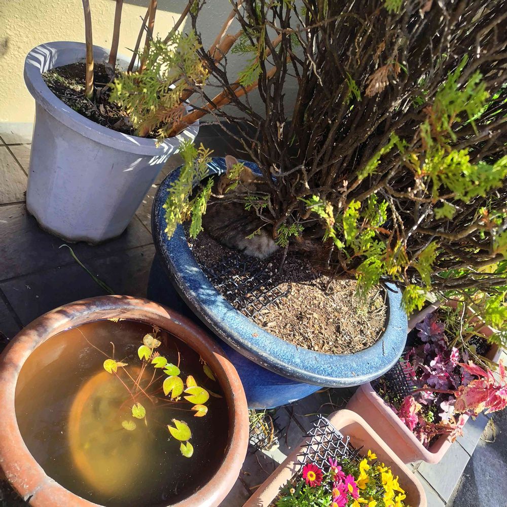 初めて行った お店の店先の 鉢の株元で、子ネコ達が お昼寝してました🐱 2匹 写ってるよ🎶⸒⸒