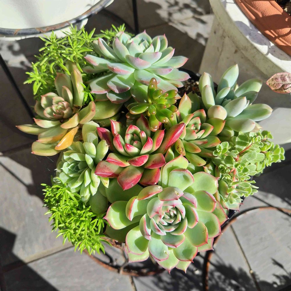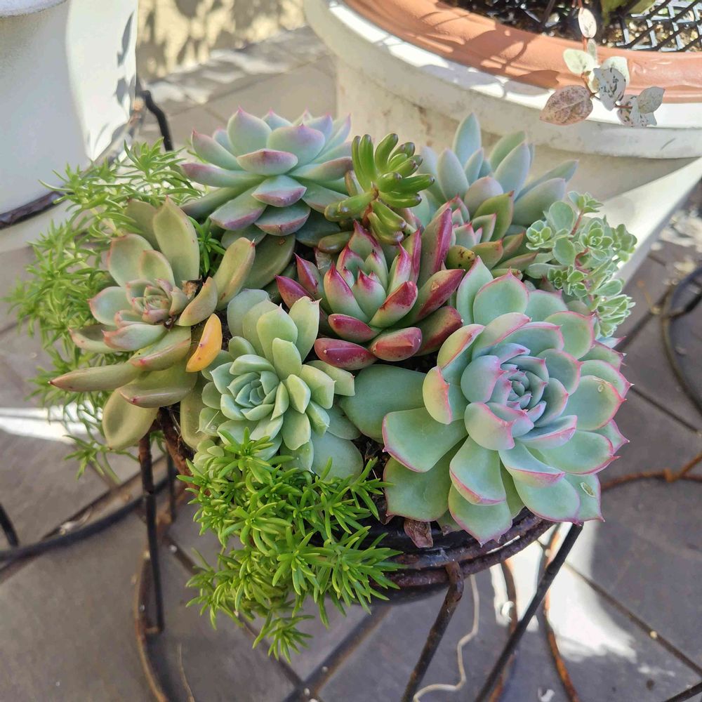 多肉植物の寄せ植えも発見❣️日向と日陰では色味が違いますね👀✨。