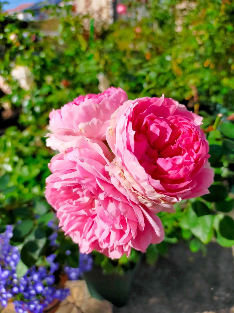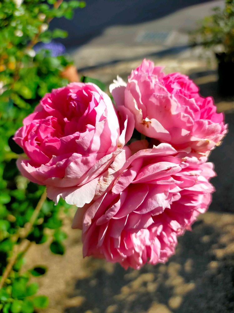 中心が濃いピンクで、外側は少し白っぽく、三輪寄り添って可愛らしく咲いた「楼蘭」🌹💖スッキリとした甘い香りがします✨
