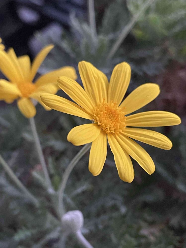 鮮やかな黄色い花とレースのようなシルバーグリーンの葉のユリオプスデージー。