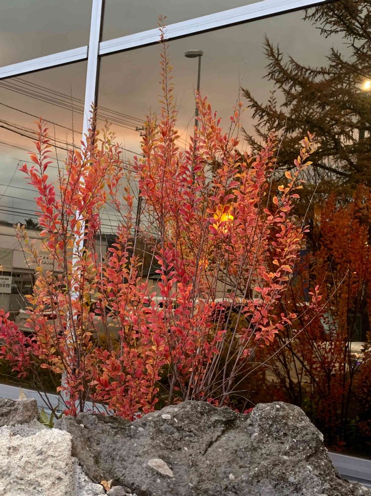 花壇のシモツケの紅葉とガラスに反射する風景がイイなと思いました。