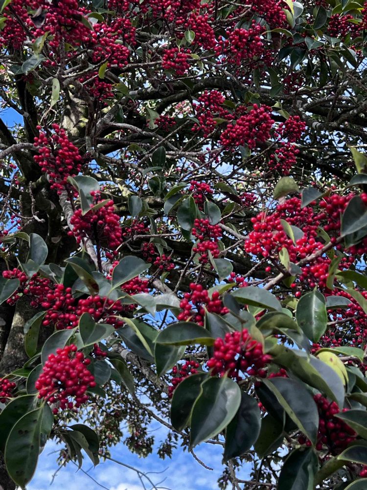 灯台躑躅紅葉と黒鉄黐の赤い実が青空に映え