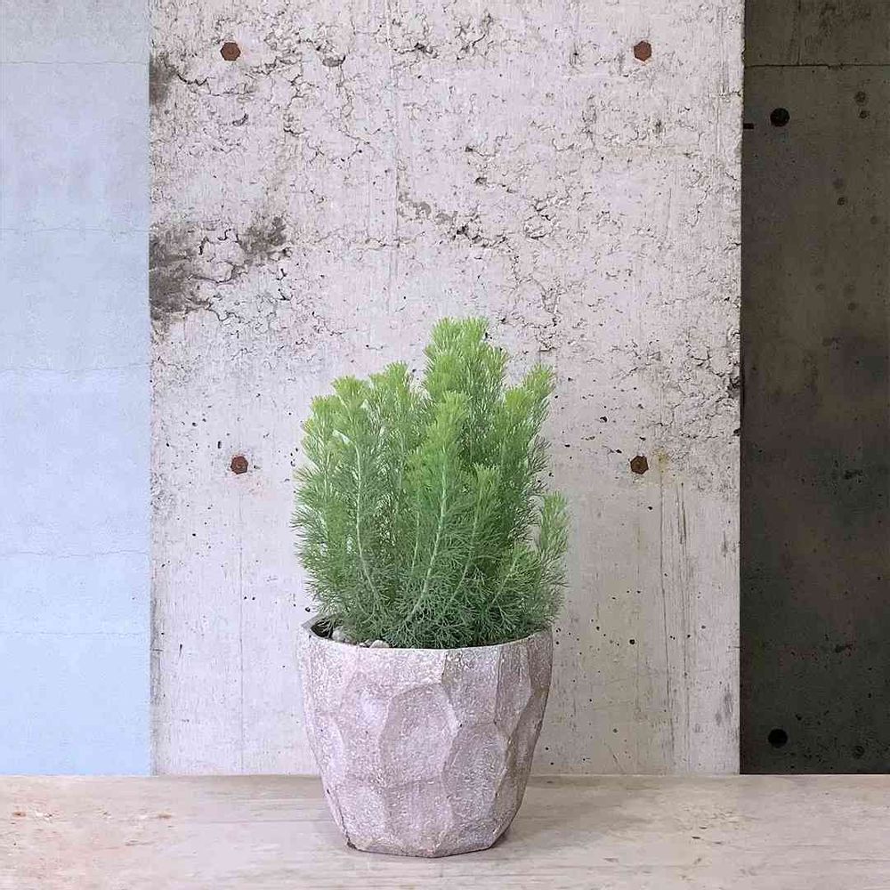 石を削り出したような質感のセメントポットにコーディネート。