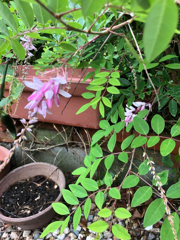 分かりにくい写真ですいません。鉢の方でなくてクレマチスの下に地味に咲いてます。低木なんですけど、分かる方がいたら教えてください