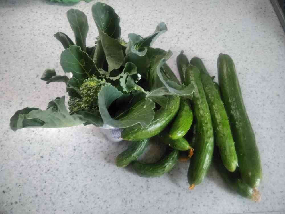 さっきの続きです。今朝の収穫です。キュウリ+茎ブロッコリーです。茎ブロッコリーは三月に種から育て、もう2ヶ月近く食卓を飾っています。