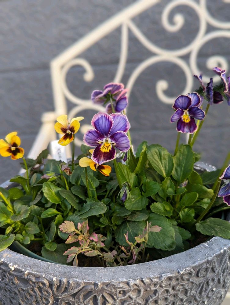 寄せ植えもビオラの両方に入ってる色が一緒💛💜でビオラ同士とリーフと混じりあって咲いたら絶対可愛いし