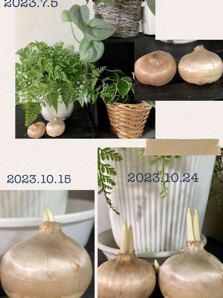 4枚目は本日撮影✨コロンとしていた球根が凹んでいます!茎も緑っぽいのが透けてます^ ^