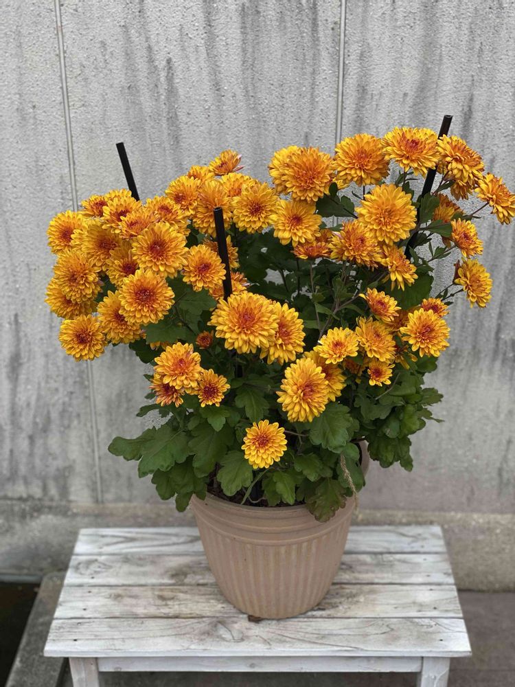 3年目、かなり切り詰めても結局よく伸びました。購入時は矮化剤が効いているそうで、小さくかわいい姿でした。伸びて広がるので紐でまとめましたが、本当は丸く詰まって咲かせる方法が知りたいです…😅菊に詳しい方教えてくださいー💦