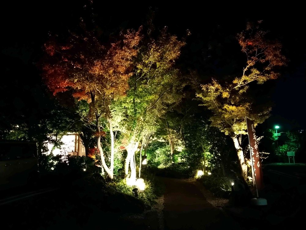 昨日、夕食を食べたレストランの入口。紅葉した木々にスポットライト。