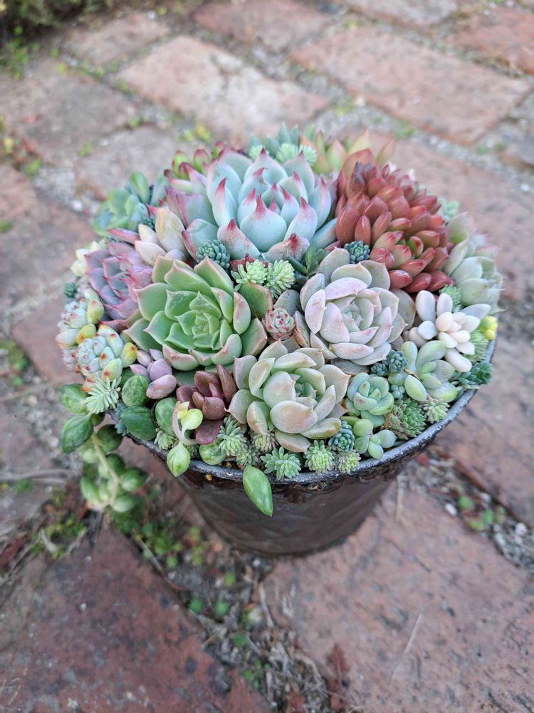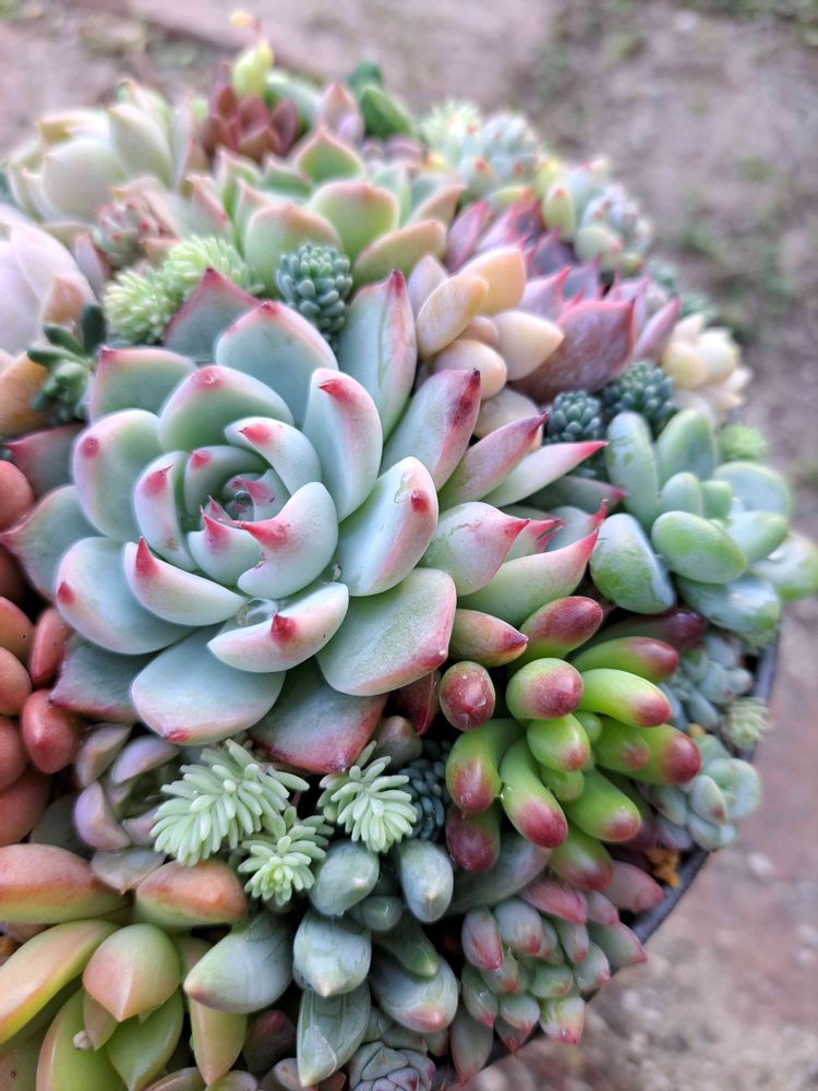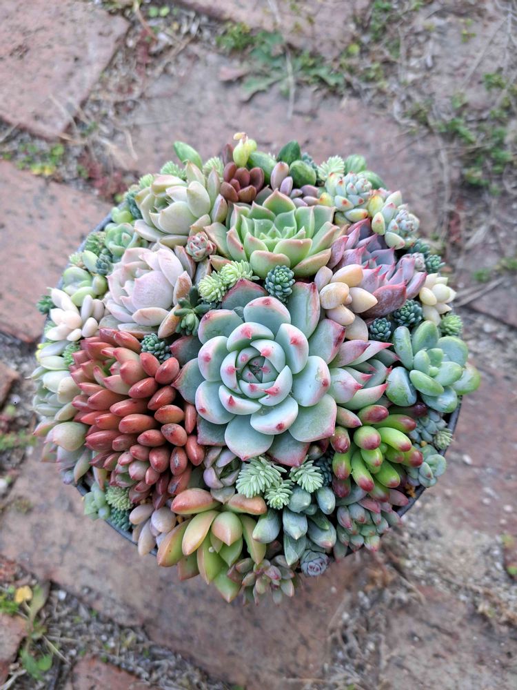 机に置いてくれる多肉さんを片っ端から詰めこんで、カラフル寄せ植えの出来上がり〜( •⌄• ).*・゚