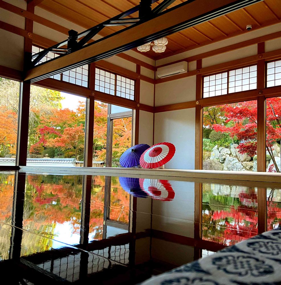漆の塗られたピカピカの床に庭の紅葉が綺麗に映り込み 皆さん屈んで写真を撮ります