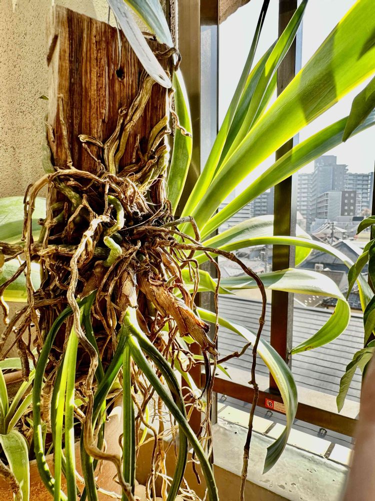 東南アジア原産の希少な着生ランで、天然木に着生されてます。長い根と多肉質の細長い葉が枝垂れる姿が特徴的だけど、しばらく放置していたらしく根なのか?葉が枯れているのか?分からない。