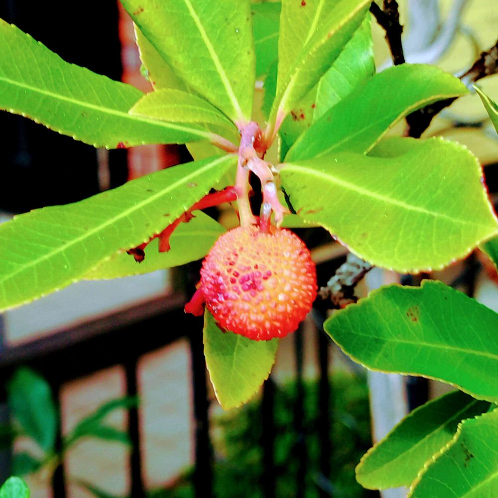 イチゴの木に沢山小さい花が咲き数年かけてスモモの様な実が付いて黄色から赤くなります