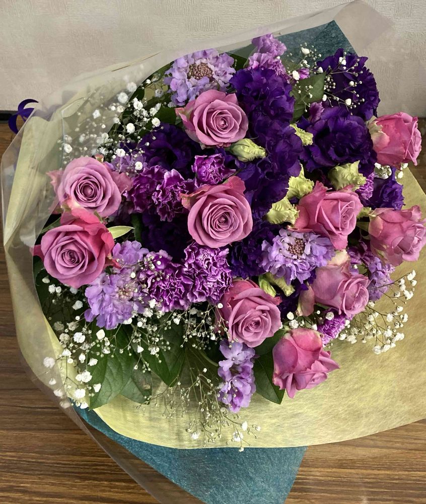 いつも素敵ですが、今日はまた特別に素敵‼️💜紫色の濃淡に、くすんだ黄色🟡がおしゃれです。こんな花束もらったら、舞い上がりますね🤗