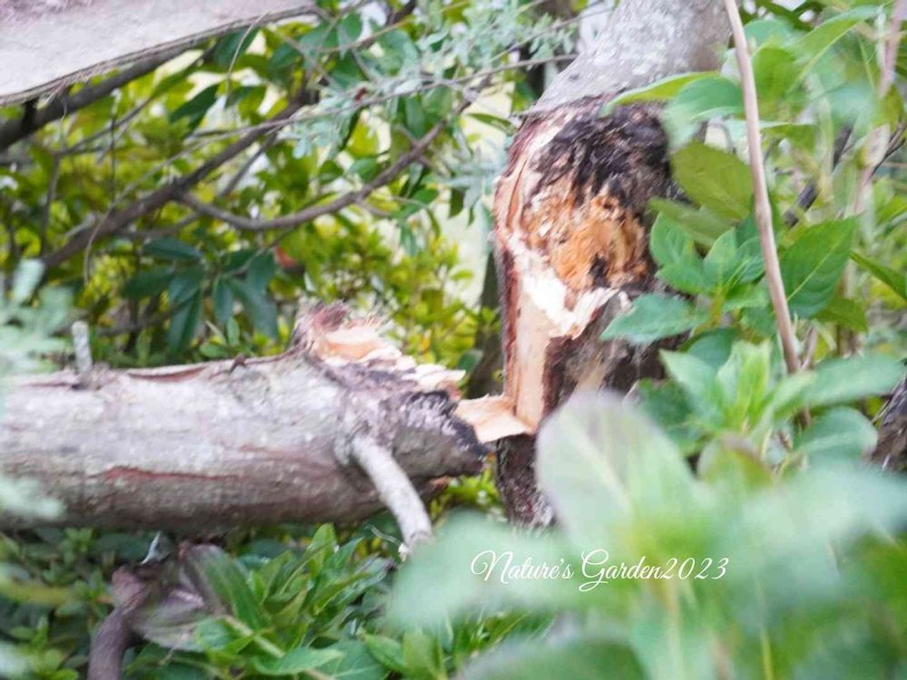 (3)(4)先々週の強風で大きな幹の半分が折れてしまったミモザ プルプレア