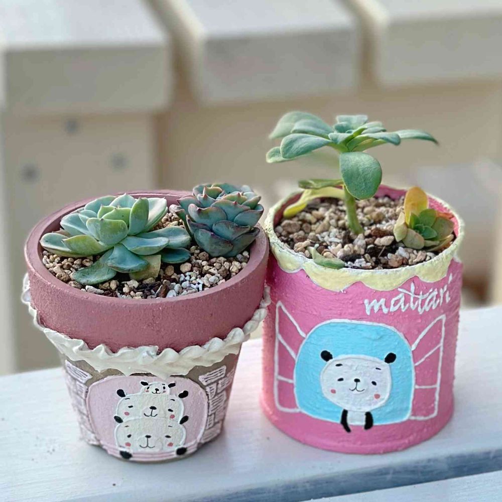 それぞれ🐼のリメ鉢リメ缶に(*˙˘˙)人(˙˘˙˶)