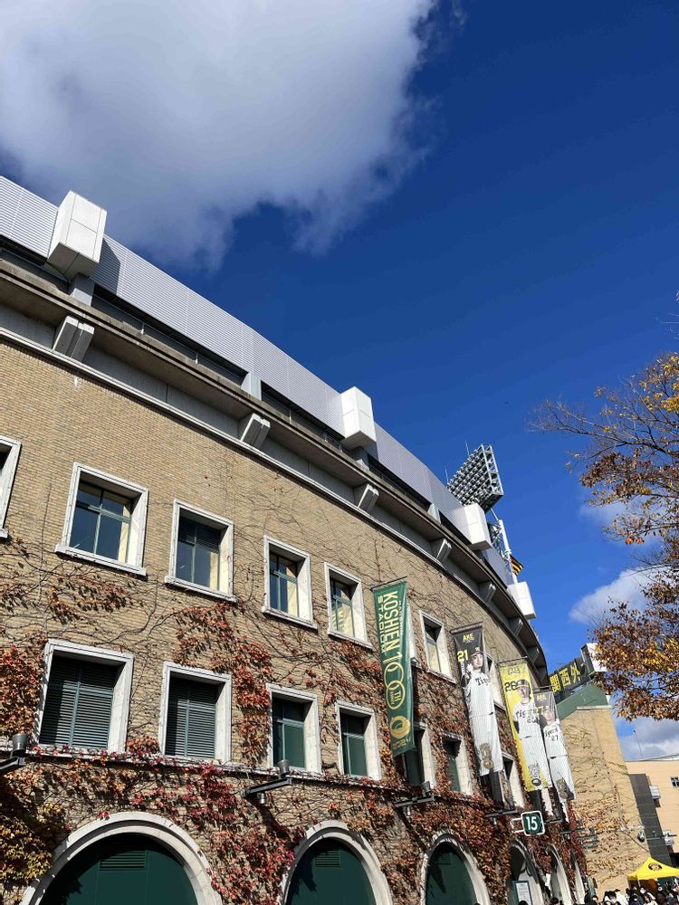 球場を覆う蔦は紅葉し、彼方には六甲の山、球場の素晴らしい緑の芝。