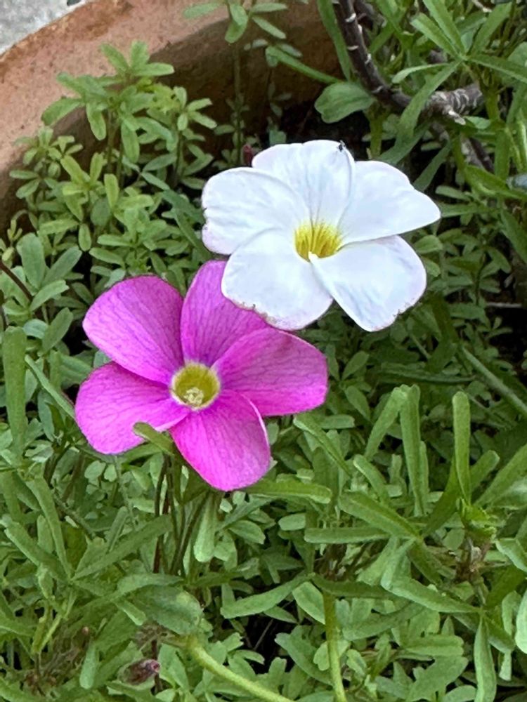 白花とピンクのお花が一緒に寄り添って可愛く咲き出しました。