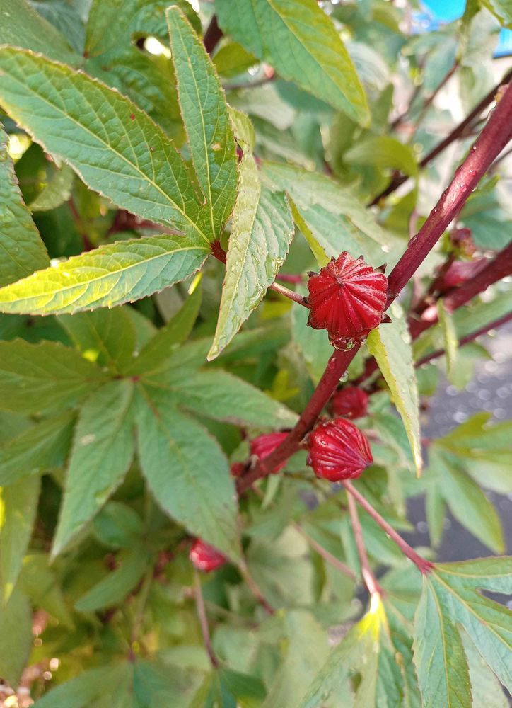 私は先日、ローゼルの実がいっぱい付いた、小さな鉢植えを買いました。