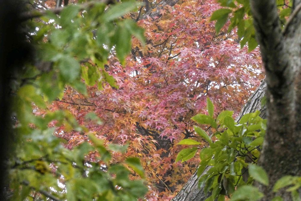 緑色の葉の向こうには、真っ赤なモミジ🍁が目を引きます。