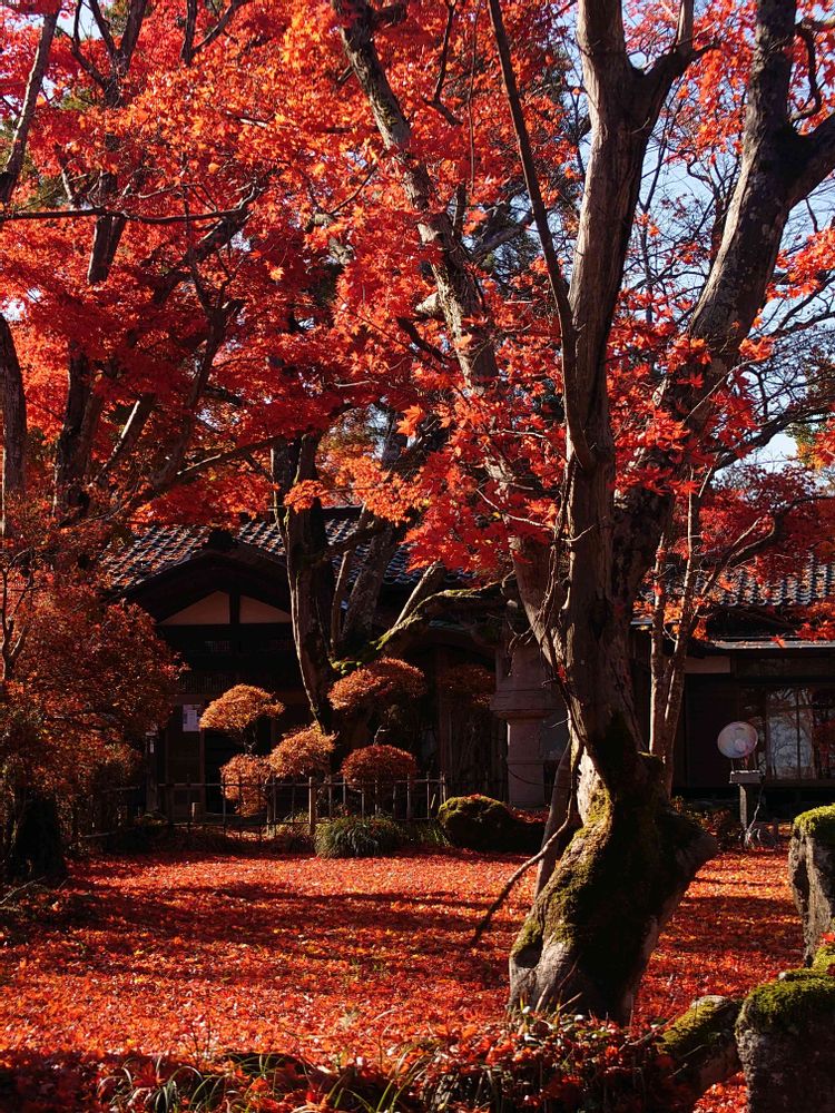 晴天の青い空と紅葉、そして、紅葉の絨毯🍁誰もいないのは朝だからですか?