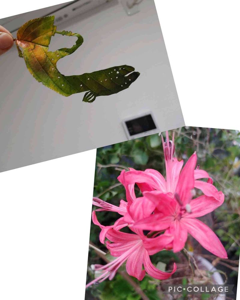 今日のお花ネリネ。鮮やかなピンクです。昨日は寒くて初めてエアコン入れました。電気ウナギの電気を借りたい一日でした。リトさん葉っぱアート真似っこ。