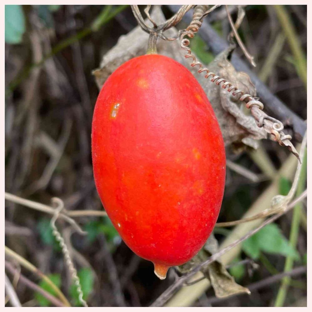 秋の散歩道には、赤いカラスウリや、いろんな木の実を見つけますね〜