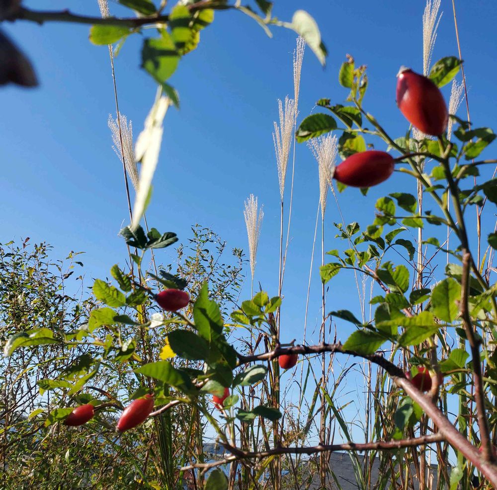 花が咲いた後青い実から真っ赤な実になるまで半年くらい楽しめるワイルドローズさんです