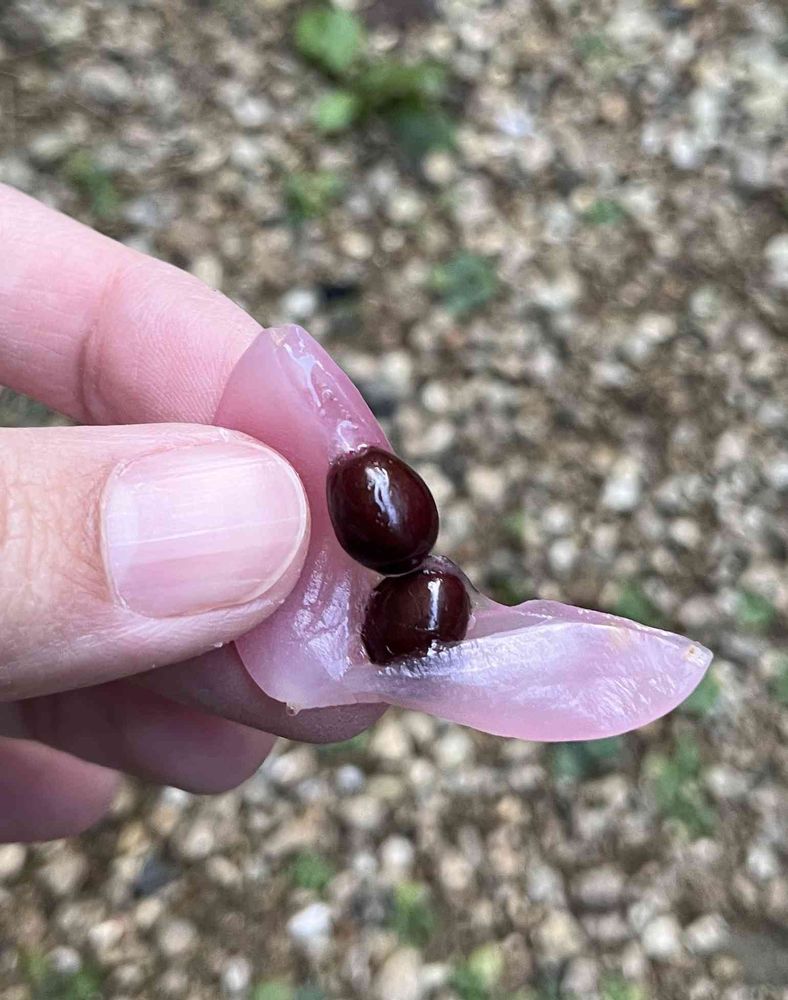 実を割ったら、ぬちょっとした中からツヤッツヤの種が2粒でてきました。