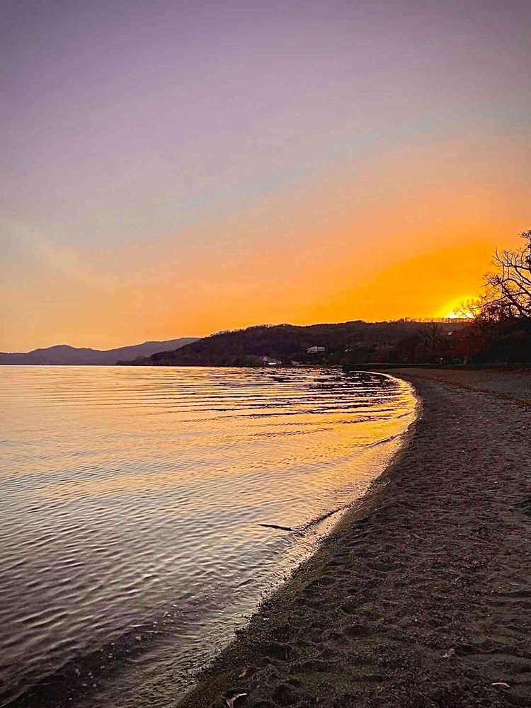 穏やかな湖面を照らす沈みゆく夕陽、素晴らしい一瞬ですね🌅