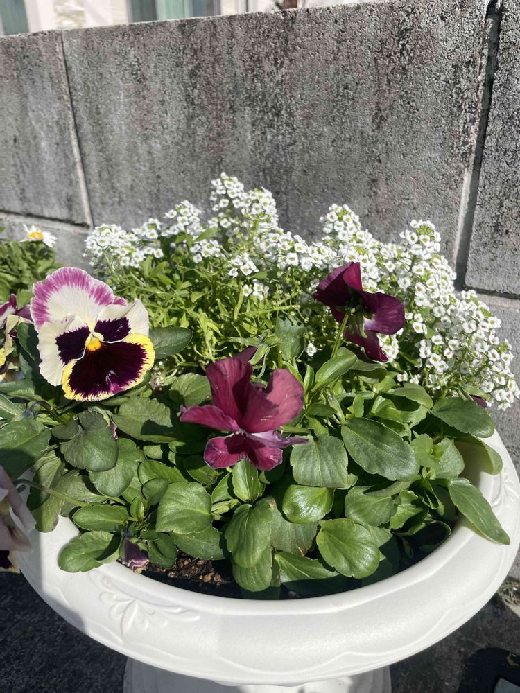 パンジーとアリッサムの寄せ植えを作ってみました😇アリッサムがもりもりになってる😄小さい花だけどボリュームあって可愛い😊