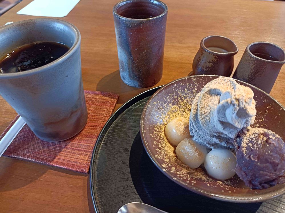 こんばんは😊植物繋がりで倉敷市美観地区の備前焼の一陽窯さん2階の喫茶店で頂いたスイーツ🥰💕職場の方と訪問しました🚗とっても美味しかったです😋備前焼で頂くと格調高くあんこや白玉、栗のお味のアイスのお味も上品でした😍💕コーヒーもまろやかな苦みで良き良き🌸備前焼の鉢もあって欲しかったのですが思いの他お高くて割ってしまったらとか考えてしまったので断念しました🥹