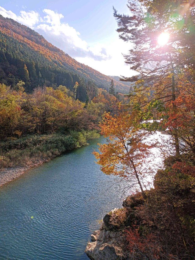 水面を太陽の光が輝き、両側に広がる紅葉🍁が、秋の深まり、季節の移ろいを伝えてくれる