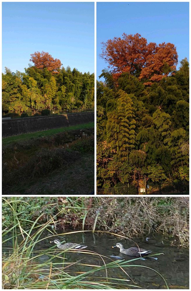 近くの川べりの背のたかーい竹林。それをさらに突き抜けて頭を出している紅葉。下の川ではカモがなかよく泳いでいました🦆🦆😀(近くの川べりの遊歩道にて)