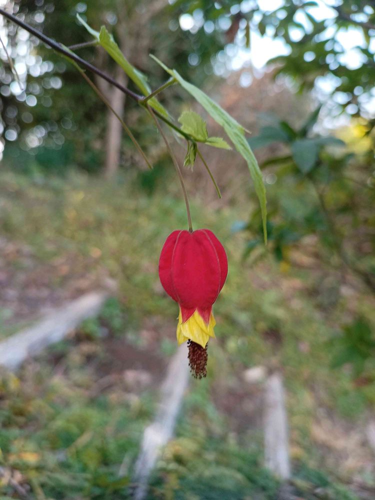 ブラジル原産の半つる性木本。枝は細く軟弱で、他物によりかかって成長し、枝先は垂れる。葉は長三角形~心形で、鋸歯があり、葉柄があり、互生する。葉腋に長い花柄のある花を吊り下げ、下向きに咲かせる。花弁は淡黄色の5弁花で、赤い5稜がある袋状の萼からやや突き出す形で咲く。花からは褐色の雄しべがついた花柱が突き出る。別名チロリアンランプ、アブチロン。
