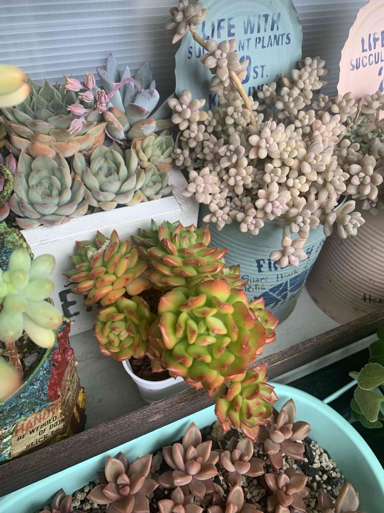 うわぁ~〜もりもりで羨ましいですぅーー入りきれてない右も左も気にかかりますーーー♥♥ピンクのリメ缶には誰が入っているんだろ?とかーーー手前のブロンズ姫ちゃんは葉挿しっこが沢山なのか、チョンパがたくさんなのか?みんなお元気ーーー😋