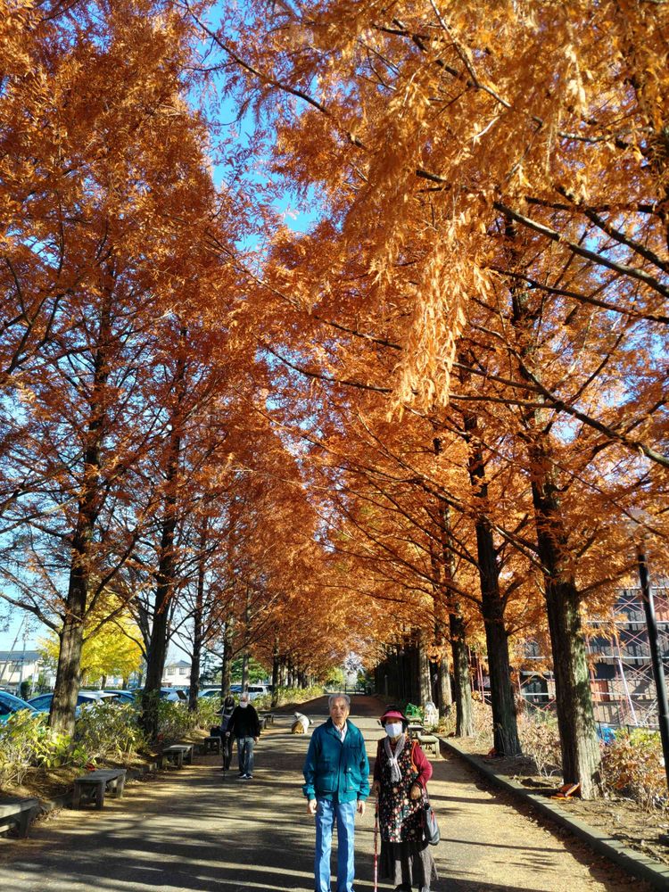 お父様の元気なお姿拝見してとても嬉しく思います。秋色のメタセコイヤの木漏れ日の中、いい雰囲気を感じます💛